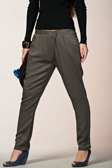 Цвет хаки. Классные брюки со множеством защипов на бедрах и косой линией застежки. Супер модная вещь в Вашем гардеробе!
