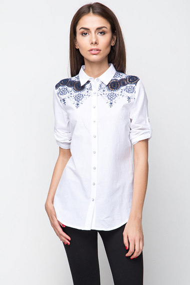 Красивая блузка с вышивкой и кружевными вставками на плечах и по спине. Модель с рукавами 3/4, рукав регулируется с помощью пуговицы.