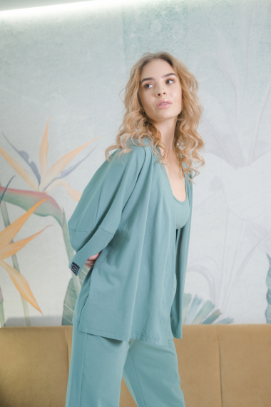 Хлопковый трикотаж премиум-класса, не скатывается и не садится при стирке. В серии Home идеально сочетаются топ, кимоно и брюки. Вы можете выбрать все позиции в одном оттенке или поиграть с сочетанием различных цветов.